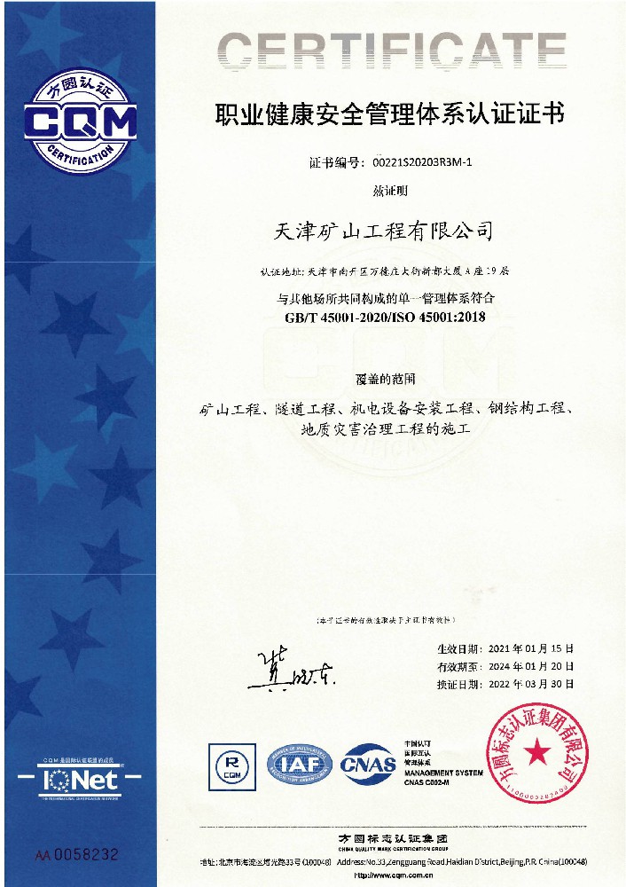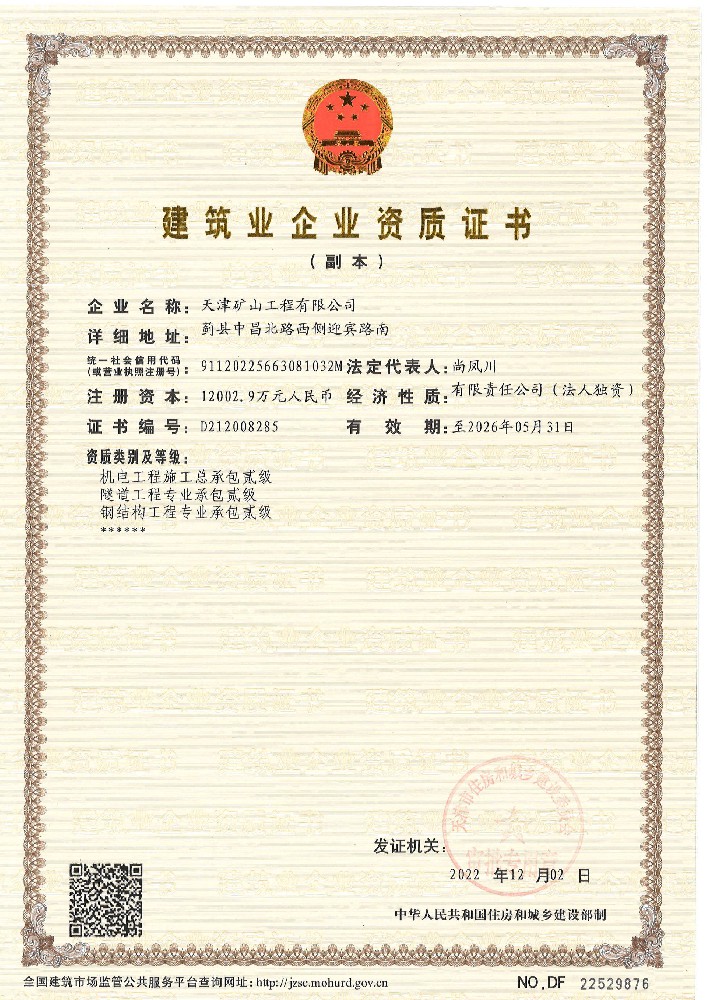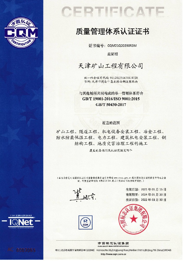 天津礦山工程有限公司(以下簡(jiǎn)稱公司)始建于1965年,隸屬中國(guó)建材集團(tuán)有限公司,是從事礦山總承包、礦山開采運(yùn)營(yíng)、礦山設(shè)計(jì)與咨詢、土石方爆破、生態(tài)恢復(fù)治理、鋼結(jié)構(gòu)制作安裝、機(jī)電設(shè)備安裝以及工程測(cè)量的專業(yè)化礦山施工企業(yè)和礦山開采運(yùn)營(yíng)總承包服務(wù)商。具備礦山總承包和爆破雙一級(jí)資質(zhì)。 公司始建于1965年,總部位于天津市···